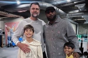 > 姚明苦主!詹姆斯今日赛后与爵士名宿奥库寒暄并合影!