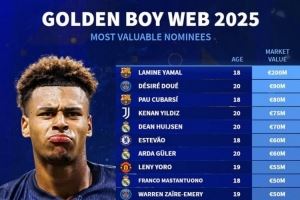 2025金童奖候选身价榜:亚马尔2亿欧 杜埃、伊尔迪兹、赫伊森在列