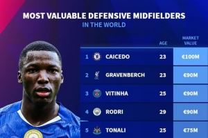 防守型中场身价榜:凯塞多1亿欧居首,赫拉芬贝赫9000万欧